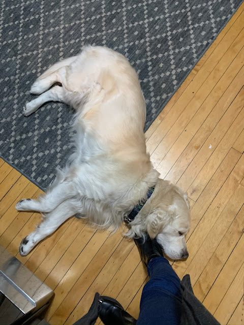 A bad man who bought me dinner hahaha (ᗒᗜᗕ)՛̵̖ The restaurant let Blue in and he just slept under the table. Then he slept in my lap on the drive back to Han's. He was the cutest weighted blanket. (*´▽`*)